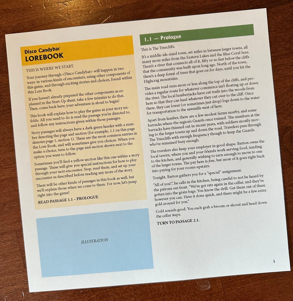 The Start-up Sheet. Reading it explains it, but the TLDR is this: The game has no rulebook — I previewed the idea in This Rules (System)! — so it needs a single page to give players a starting point. When (if…) Disco Candybar gets manufactured, this will be the first thing players see when they take the lid off the box.